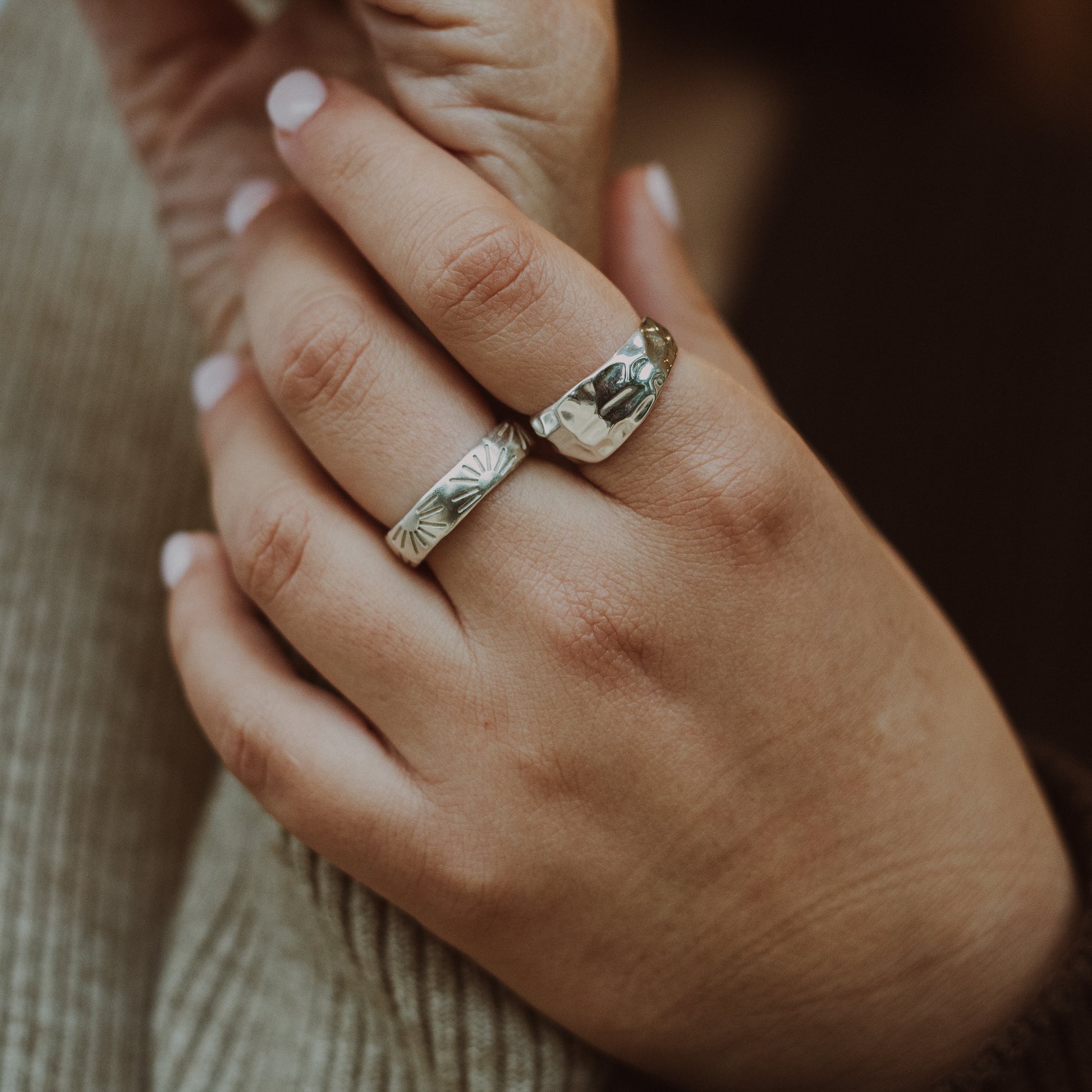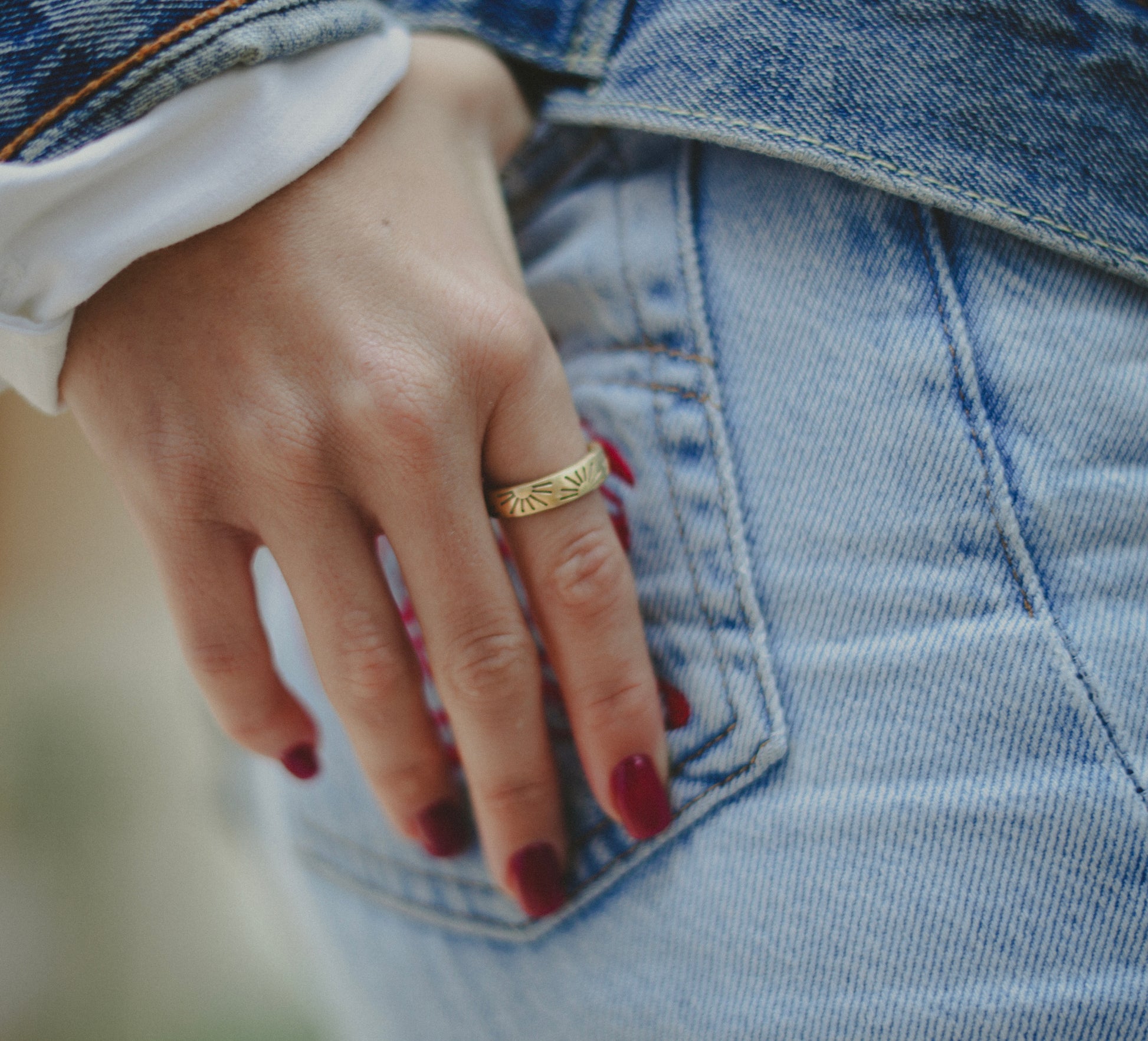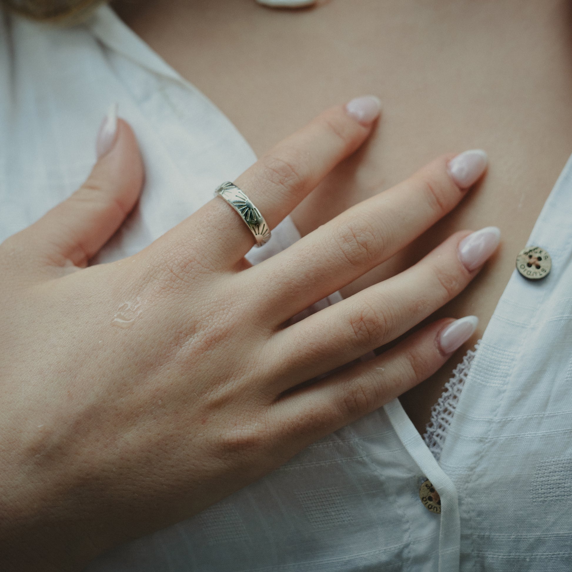 This open ring is engraved with sun patterns all over.